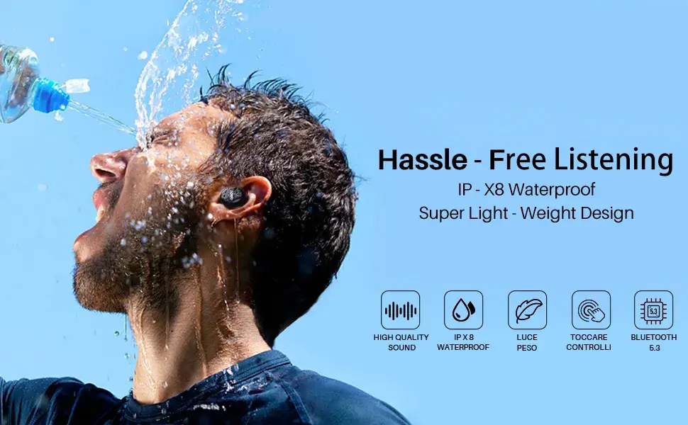 – Chống nước IPX8: Lớp phủ Nano bên trong tai nghe và hộp sạc cho phép chống thấm nước ở độ sâu 1 mét trong 30p. Khi đeo tai nghe không sợ gặp phải những cơn mưa đột xuất hay đổ mồ hôi khi chơi thể thao, có thể đeo khi bơi. Tai nghe và hộp sạc thậm chí có thể được rửa sạch bằng nước và xà phòng.